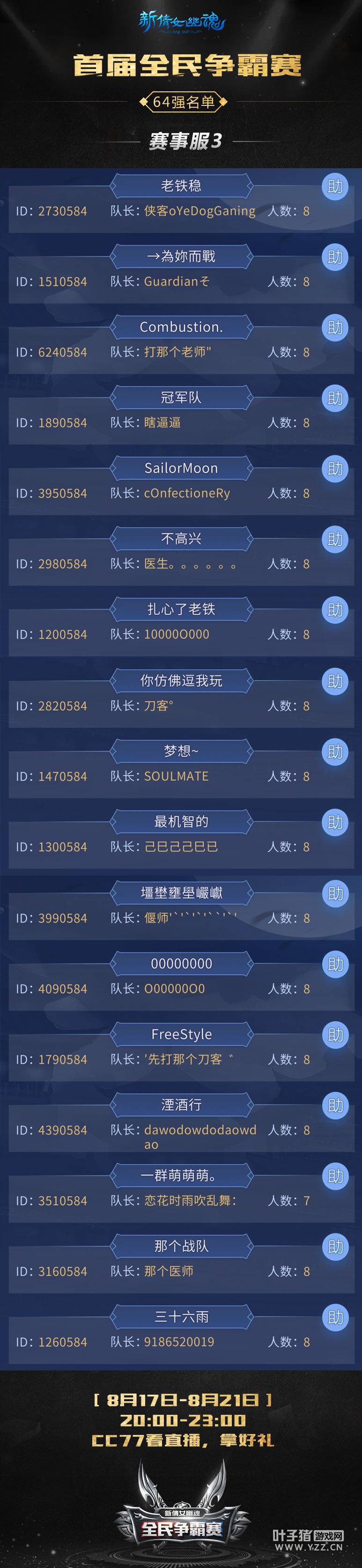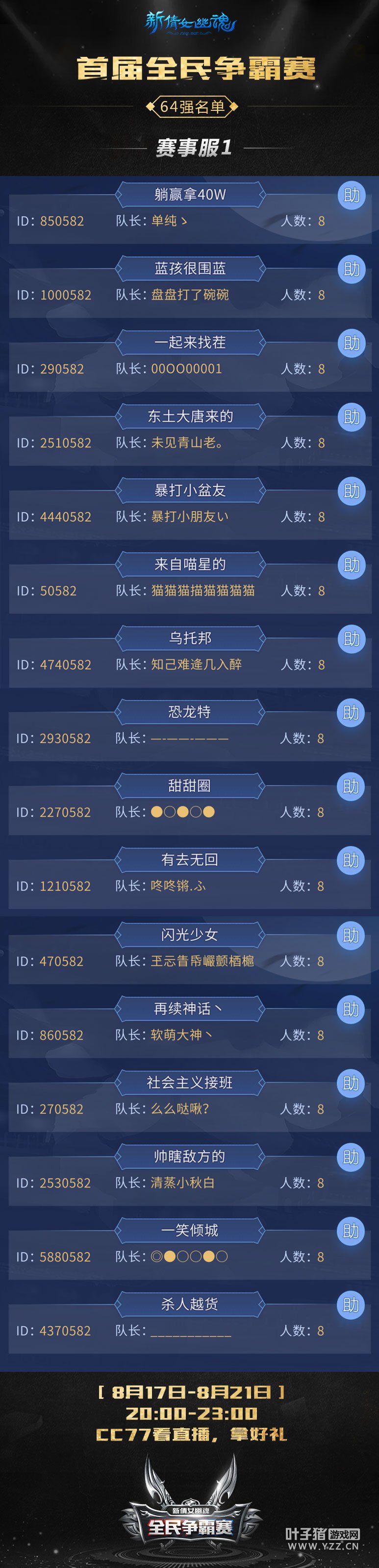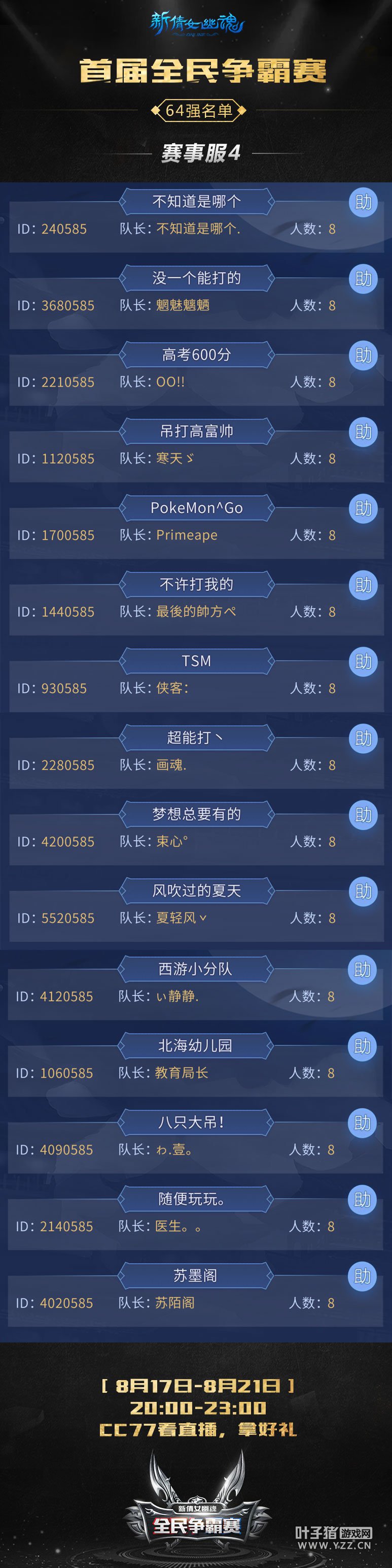 “刀光剑影聚云巅,全民争霸震三界!”《新倩女幽魂》首届“全民争霸赛”预选赛于13日落下帷幕。经过三天激烈的角逐,最终有六十四支队伍在预选赛中脱颖而出,成功晋级小组赛。让我们恭喜以下队伍,期待他们能在后续比赛中,带给我们更精彩的战斗! 更多精彩内容,尽在叶子猪倩女幽魂。 [编辑:辰辰]