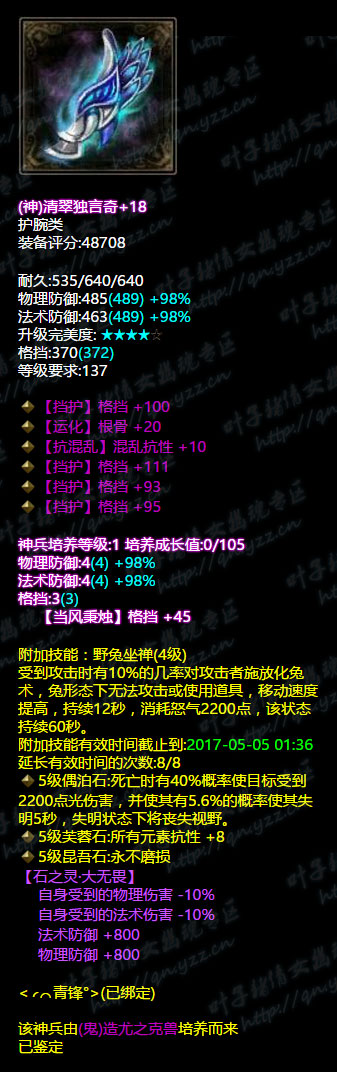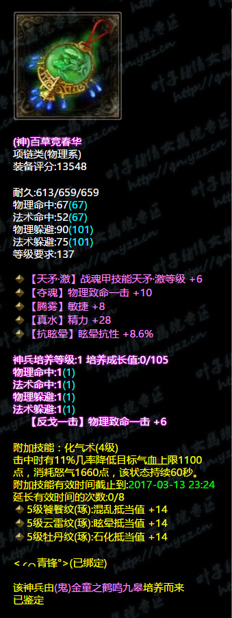 【叶子猪倩女幽魂原创专稿,未经授权禁止转载。如有雷同,都是搬我们的。】 还记得那把固定双最大+无钻的倩女第一单手偃甲吗?拥有者青峰原本是九州月大区第一偃师,但是小编今天突然发现青峰居然专职成了战甲,而且已经转职接近一个月了。 转职之后的青峰依旧是战甲第一人,同样的单手核武器虽然没有从前的惊艳,不过也是相当吓人的存在了,今天小编就为你带来战甲青峰的装备秀。 装评66W+,和以前偃师一样 单手战甲核武器,5级悟则圣,土豪必备,亮点一般。 6绝不修双敏捷金属甲,小编就是凭借这件装备确认了是青峰本人,非冒牌。 项链天矛激,选择核心输出技能加成以及晕抗,没毛病。 金属盔极品,双百分比抗性+双敏捷,以前的5法躲已经被雪藏了。 |