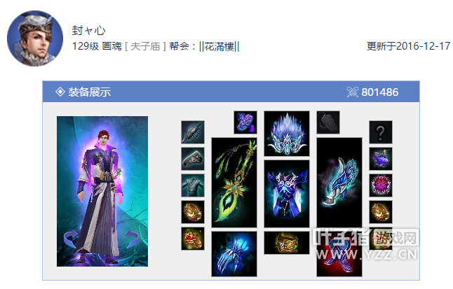 129级夫子庙封心,可以算得上是全服顶尖的卡级大神了,129装评高达80W,全身7级神兵,装备细节也无可挑剔,只差一把核武器即可成神。