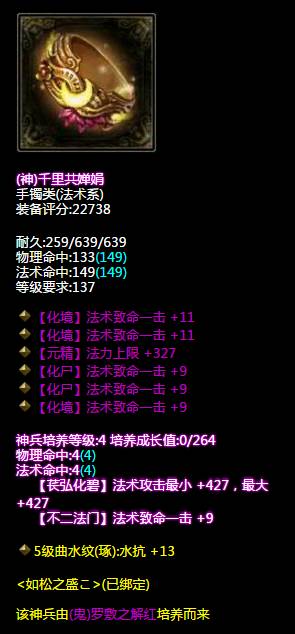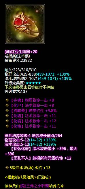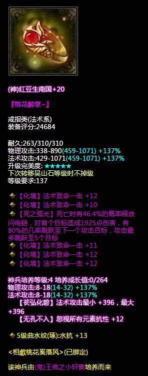 大家是否记得小编前段时间展示的相歔桃花奚落风的断恨刀客装备秀呢?最近发现桃花大神突然转职成了异人!听说是因为四世才转的呢~ 那么大家就来看看桃花大神转职后的装备能不能把四世打过吧! 71W异人装备秀 (相歔桃花奚落风 ) (神赐不修最大长杖) 先来看看这把完美强化的双手杖, 神赐与不可修各增加了50%基础属性, 百分比最大法术攻击、电攻击、四级神兵、 五级大势至都给武器增加了不少的输出! (双不修逆天布甲) 下面到这件减伤布甲了, 双不可修复、三最终减伤、 一最终法术减伤,还有四级神兵的减伤与 五级善根生的百分比减伤, 妥妥地保护好自己! (法攻布盔) 然后就是这件双智力、法术攻击红布盔了, 与前面两个装备比要逊色一些, 不知道桃花大神会不会换掉这个头盔呢~ (双神赐腰带) 双神赐、晕抗、混抗腰带, 在四级神兵中忽视所有元素抗性+13, 所有控制抗性+11,看来是个抗性腰带。 另外这个附加技能看得倩倩好心动~ (神赐手套) 神赐、四敏捷、晕抗手套, 前几天倩倩曾经为大大们介绍过敏捷, 看来这手套的命中与躲避也是不低~ (百分比晕抗鞋子) 三敏捷、百分比晕抗、减伤鞋子, 可抗可躲可防,是双好鞋! (三致命项链) 三法术致命、睡眠抗项链, 法术致命+33! (五致命手镯) (四致命晕抗敏捷手镯) 这对手镯堆的也是致命, 一共九法术致命,致命再加91! (四法术致命戒指) (五法术致命戒指) 最后是这对戒指, 也是九法术致命,附带百分比晕抗, 这些首饰的攻击力好高啊! 看完了桃花大大的装备,大家有什么感想吗?欢迎留言分享哦~ 了解更多相关信息,请前往http://qn.yzz.cn/ [编辑:犀利摇]