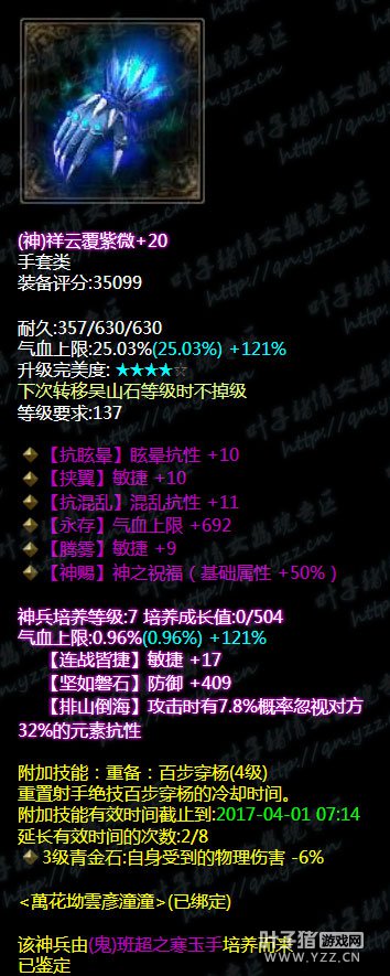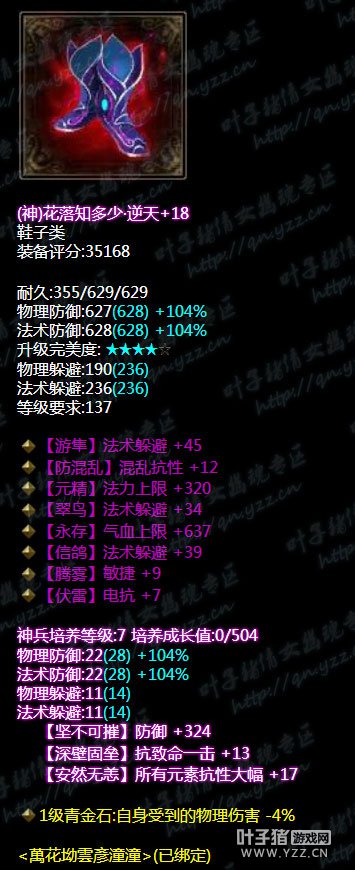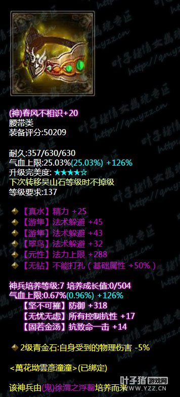 手套 混乱抗性眩晕抗性双敏捷神赐腰带。神兵培养属性敏捷+17.带重置百步穿杨技能。气血值是有了同时也有了敏捷度,下三件应该都是以补装备属性为主。 腰带 三法躲无钻腰带,神兵培养属性所有控制抗性+17。果然是和手套是一样补属性,在衣服缺少属性下,用其余装备来补。 鞋子 逆天三法躲,混乱抗性电抗腰带。神兵培养属性所有元素抗性大幅。单手武器在没有护腕的情况下本身就缺乏了少一件装备的优势。巧妙的是大神在利用其他的装备来补。这一点值得学习。