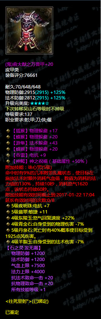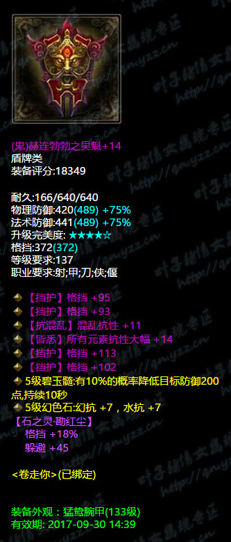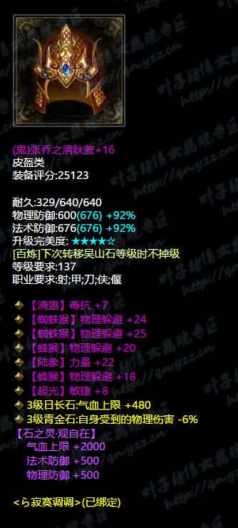 【叶子猪倩女幽魂原创专稿,未经授权禁止转载。如有雷同,都是搬我们的。】 法躲格挡是现在倩女的主流,但是在物理职业强势的大环境下不少玩家开始选择物躲格挡的路线来应对,今天小编为大家带来的就是传说中的物躲格挡刀客——ら寂寞调调。 武器:5级悟则圣,不是核武器差评,7绝双最大,克射手+20%,还可以,神兵属性还未开,等绝世功大区开放神兵后还可以更上一层楼。 衣服:4级发无漏,打不起善根生发无漏就是最好的选择。固定3物躲+1法躲,物躲加成57点,6绝神赐,没有选择极限的敏捷物躲属性,折中选择了加强防御。 盾牌:4格挡盾牌,属性完美,5级勘红尘,极限堆格挡,强化差评,居然只有+14,你怎么对得起大神的称号。 头盔:3级观自在,7绝4物躲+1敏捷+力量,物躲加成87点。