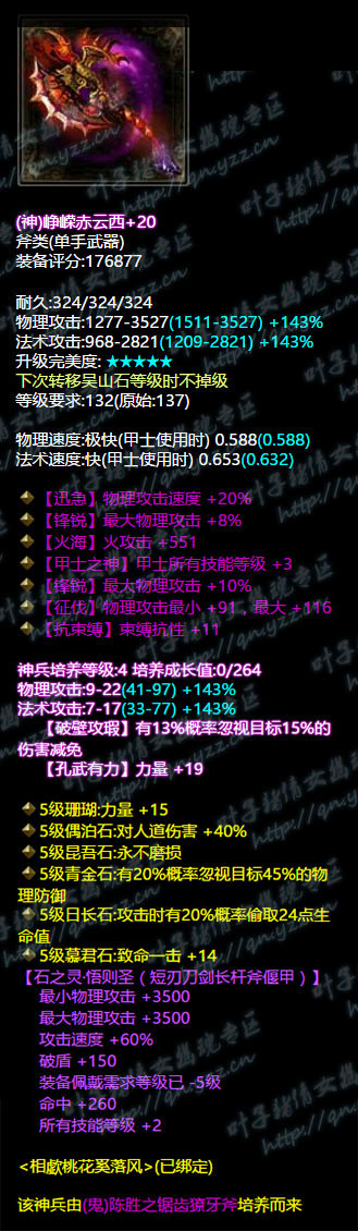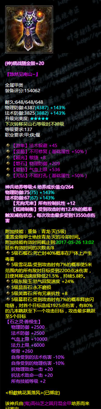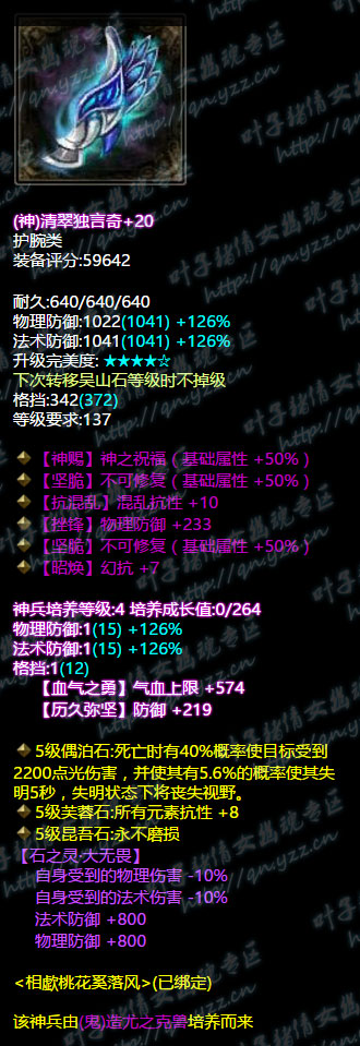 【叶子猪倩女幽魂原创专稿,未经授权禁止转载。如有雷同,都是搬我们的。】 桃花大大又转职业了,这次是传统搅屎棍金甲,在3月23号那天异人转职成为了金甲,看来桃花大神每个月都会换一个职业玩的样子。一起来看看吧! 武器 7绝双最大,不不是核武器,5级悟则圣,作为一个曾经的5级大势至方士来说,石头都不是问题。4级神兵,强化+20满143%。 衣服 6绝不修+无钻,基础上没有比逆天双不修鬼布衣多很多,鉴定技能重置青龙灭,4级神兵,5级善根生。 护腕 神赐+双不可修,基础破千,完全撑基础的一件装备,非常稀有,不过也只有对防御加成很高的金甲才会有作用了。