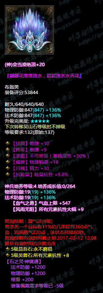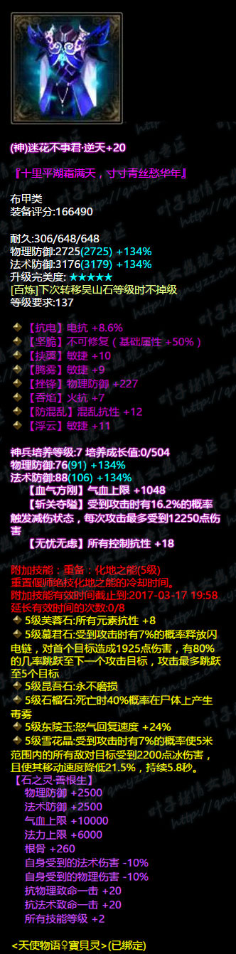 当年的异人第一鬼杖,逆天不修双最大,7级神兵,5级大势至,鉴定技能重置天地留白已经过期,不过转职成为画魂之后攻速很可能会成为一个致命的问题。 衣服 逆天不修,3敏捷+混抗+电抗百分比,也是7级神兵,减伤和控制抗必不可少的神兵属性,5级善根生土豪的必备。 帽子 固定双敏捷不可修,6绝+晕抗百分比,5级神境通+4级神兵凑齐双大幅。