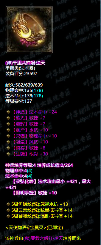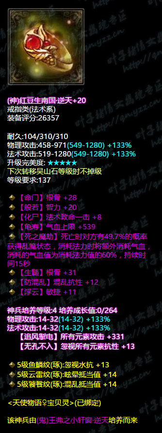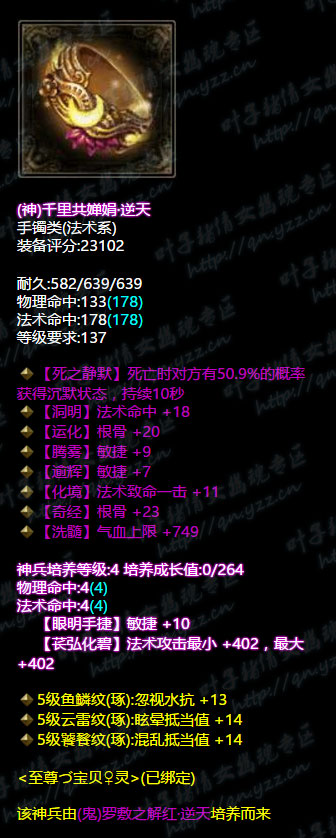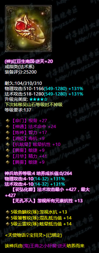 固定庄周梦蝶+天地留白,极品中的极品,洗出晕抗百分比,4级神兵,敏捷+法攻。 手镯 4敏捷+3敏捷手镯,4级神兵,带晕抗水抗、法术命中,总体来看不是十分完美,强迫症看着会很不舒服。 戒指 敏捷智力混抗致命属性,比较乱,没有很好地针对某一个属性,在小编心目中只能给个及格分。