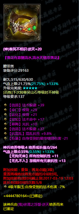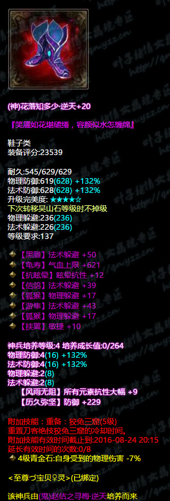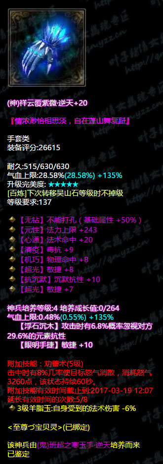 当年的异人第一鬼杖,逆天不修双最大,7级神兵,5级大势至,鉴定技能重置天地留白已经过期,不过转职成为画魂之后攻速很可能会成为一个致命的问题。 衣服 逆天不修,3敏捷+混抗+电抗百分比,也是7级神兵,减伤和控制抗必不可少的神兵属性,5级善根生土豪的必备。 帽子 固定双敏捷不可修,6绝+晕抗百分比,5级神境通+4级神兵凑齐双大幅。 固定庄周梦蝶+天地留白,极品中的极品,洗出晕抗百分比,4级神兵,敏捷+法攻。 手镯 4敏捷+3敏捷手镯,4级神兵,带晕抗水抗、法术命中,总体来看不是十分完美,强迫症看着会很不舒服。 戒指 敏捷智力混抗致命属性,比较乱,没有很好地针对某一个属性,在小编心目中只能给个及格分。 手套 逆天无钻双敏捷,还有一条沉默抗,4级神兵,忽视元素抗+敏捷。 腰带 逆天、敏捷、混抗百分比,4级神兵,全控制抗+忽视元素,合格的腰带。 鞋 3法躲+双物躲+敏捷,有点大神的样子了,4级神兵,再多一条全大幅抗性。 总结 宝贝灵的装备应该自从法躲流派兴起之后就没有很大的变化了,命中之类的属性应该是完全跟不上同评分段节奏的,不过作为一个传统的画魂来说,输出还是十分爆炸的,虽然没有画魂核武器,但是4W8的法攻还是实打实的排在倩女前列。 更多精彩牛图,尽在叶子猪倩女幽魂。 [编辑:犀利摇]