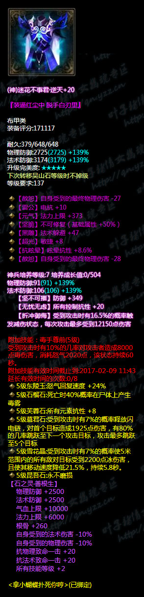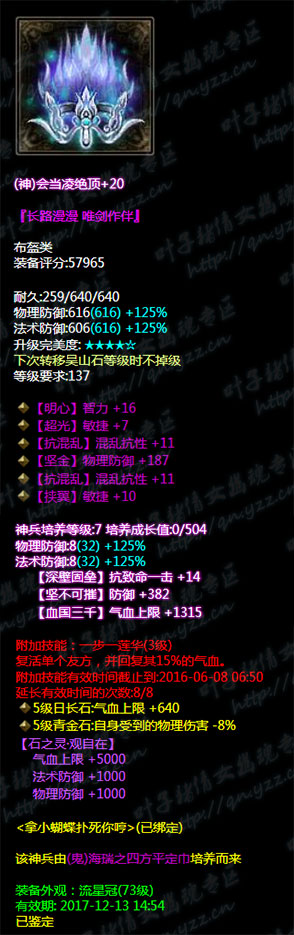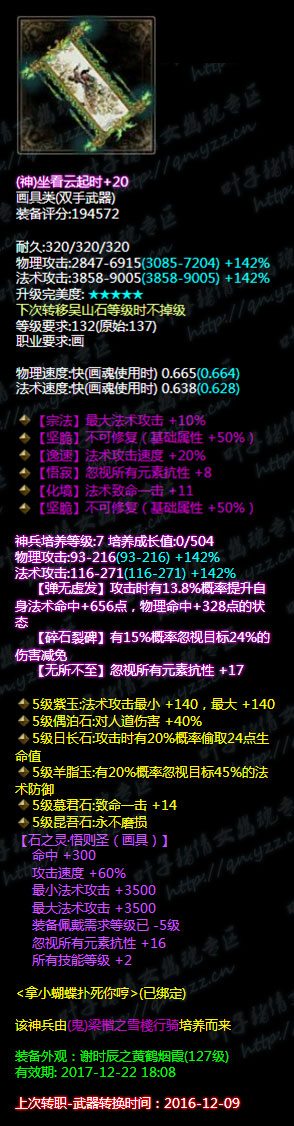 【叶子猪倩女幽魂原创专稿,未经授权禁止转载。如有雷同,都是搬我们的。】 在倩女幽魂里,我们通常见到的画魂都是拿单手武器的矮子,去堆一下忽视水抗打人还是很伤的。那么今日的主人公却是拿一个拿双手武器的抗性画,同时也是全服最大法术攻击的拥有者。我们一起来看一下大神是怎么搭配自己的装备的吧。 武器: 六绝,双不可修,忽视所有元素抗性+18。这样的武器无疑让本身的攻击就达到了一个很高的地步,同时忽视所有元素抗性+18可以让其他的装备在忽视抗性的基础上还可以选择别的属性,例如衣服的属性原本想培养出忽视元素抗性,那么就可以选择别的属性例如抗致命一击之类的。 衣服: 逆天不可修衣服。带有双减物理伤害效果而且还带眩晕抗性比。神兵培养属性也是带有所有控制抗性+20。画魂带双手本来就少了一个护腕装备,在防御类的装备上最好是选择增加大幅抗性或者防御,大神选择的是站在前排暴力输出所以堆的是抗性。 头盔: 六绝双混乱抗性双敏捷头盔。这下看得出大神要的就是抗性。神兵培养属性选择抗致命和防御气血的属性。渐渐的弥补六绝属性的不足。