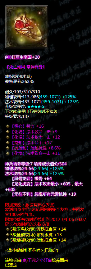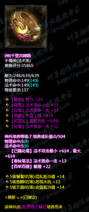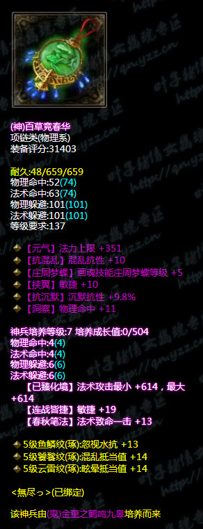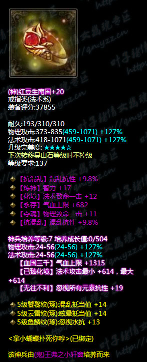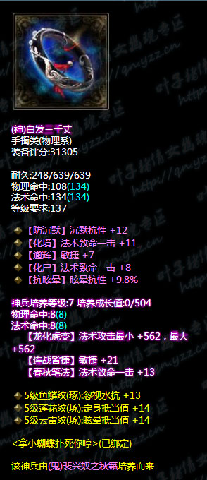 项链: +5的蝴蝶技能,混乱抗性+10,沉默抗性比项链。可以说是个神装了,矮子的蝴蝶技能本来就很难洗出来更何况双抗性的属性。 手镯: 一个是五绝一个是六绝装备,五绝装备以沉默抗性+12,眩晕抗性比为主。利用神兵培养属性成为三致命双敏捷。六绝装备是混乱抗性比带四致命。 戒指: 其一是双混乱抗性比的手镯,我的天需要多强的魅者才能控得住。另一个则是三致命带混乱抗性比戒指。 点评: 大神走的路线是暴力输出抗性流画魂,这样搭配装备能够很好的发挥画魂的输出能力,人头收割手到擒来,值得大家去学习借鉴。而且大神的神兵培养属性也是搭配的很奇妙,并没有按照传统的弥补缺少一装备的属性来打造,而且全是来输出的路子走。装备并没有很追求极致,有抗性就好,如果追求极致的话,我相信大神的输出还会再高甚至装备评分也能达到90万。期待大神的下步打造装备。 更多精彩牛图,尽在叶子猪倩女幽魂。 [编辑:犀利摇]