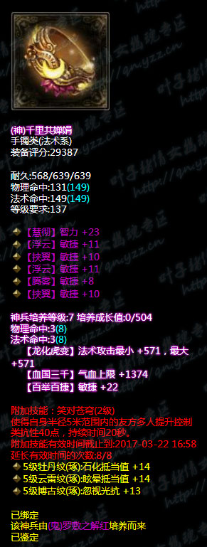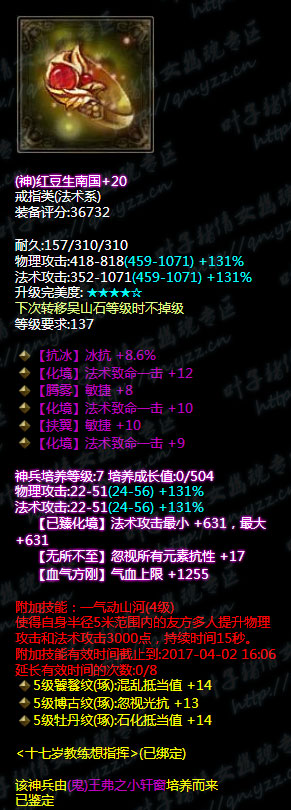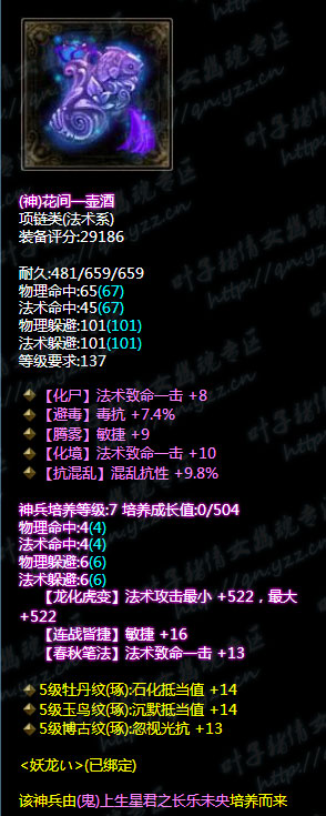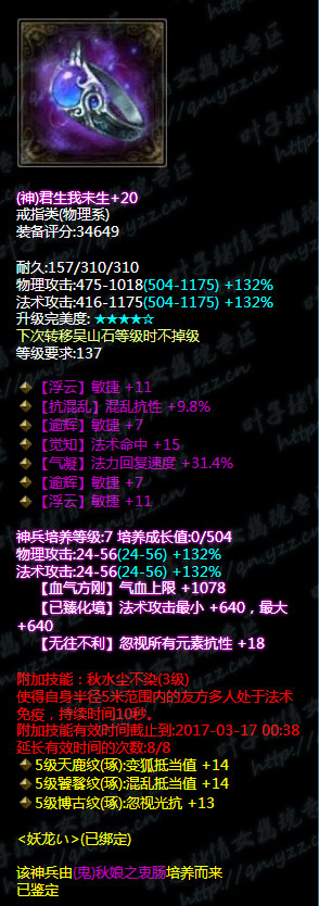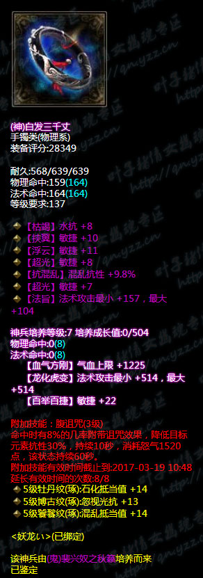 项链: 配合神兵培养属性让项链成为了三致命项链。同时带毒抗比混乱抗性比,狗王这个职业怎么说呢还是蛮脆的,射爷这种远程的高攻击职业无疑成为了第一防御的对象,堆毒抗也是很有必要的。 手镯: 其一是混乱抗性百分比手镯,配合神兵培养属性是5敏捷,这就尴尬了大神没有选择去选择致命一击。其二则是6敏捷的手镯。现在狗王也走敏捷流了,不过像第一狗王这么追求敏捷的还是第一次见。 戒指: 其一双敏捷三致命戒指。这么看来在项链和戒指上是选择致命。其二是四敏捷戒指,带混乱抗性比。看到这狗王的追求就是抗混乱,追求敏捷。 点评: 第一狗王的装备围绕着混乱抗性来展开,同时在敏捷的追求上真的是做到了极致,第一次见到这么追求敏捷的狗王。我们知道狗王是靠狗吃饭的但是怎么说呢,狗的属性来源于本身,所以自身硬才是王道。第一狗王给我们诠释了如何去做一个合格的狗王,大家都学到了吗? 更多精彩牛图,尽在叶子猪倩女幽魂。 [编辑:犀利摇]