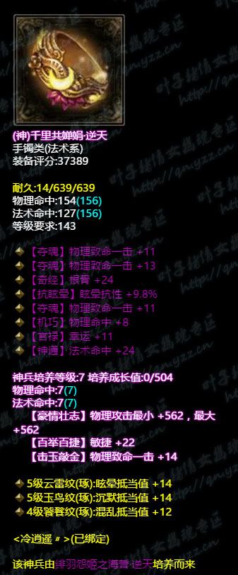 传说中的极品,固定刻骨针+穿云手+物理致命,洗出苍龙破封,7级神兵,物理致命+物攻敏捷,鉴定重置化地之能刚好过期。 手镯 2个手镯共8条致命,附带晕抗百分比,7级神兵,致命物攻敏捷,鉴定技能云深七重影,所有人防御+3000。 戒指 2个戒指提供7条致命,都是7级神兵,物攻+气血+忽视元素抗,鉴定半卷珠帘,10秒内友方多人物理减伤提高50%。