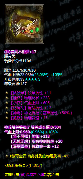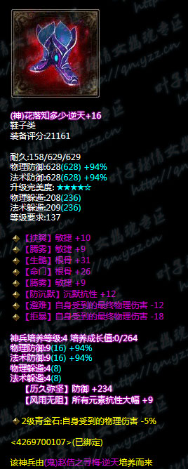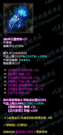 手套: 手套是装备中增加气血的装备之一,那么此手套的属性是七绝+17,属性则是眩晕混乱抗性。一条气血上限一条根骨,并没有无钻神赐之类的属性。神兵培养属性则是加敏捷+防御的。看到这呢小编可以说是知道了大神的搭配方法,在装备上大多数选择热门属性,例如抗性等等这点稍后再说。 腰带: 6绝的神赐腰带。属性则是眩晕混乱抗性单气血上限。这么看来属性也是很平常的,那么神兵培养等级是7级增加的气血就会多一些,神兵培养的属性是增加防御控制抗性,宝石是打的青金石减伤,这样就跟观自在石之灵头盔配合起来了。 鞋子: 逆天的鞋子。三敏捷带双根骨属性,而且最后两条属性都是减伤属性。神兵等级是4级,属性则是增加防御和元素抗性大幅,这样以鞋子的神兵培养属性增加元素大幅,弥补护腕的属性,宝石也是同样打的青金石减伤。