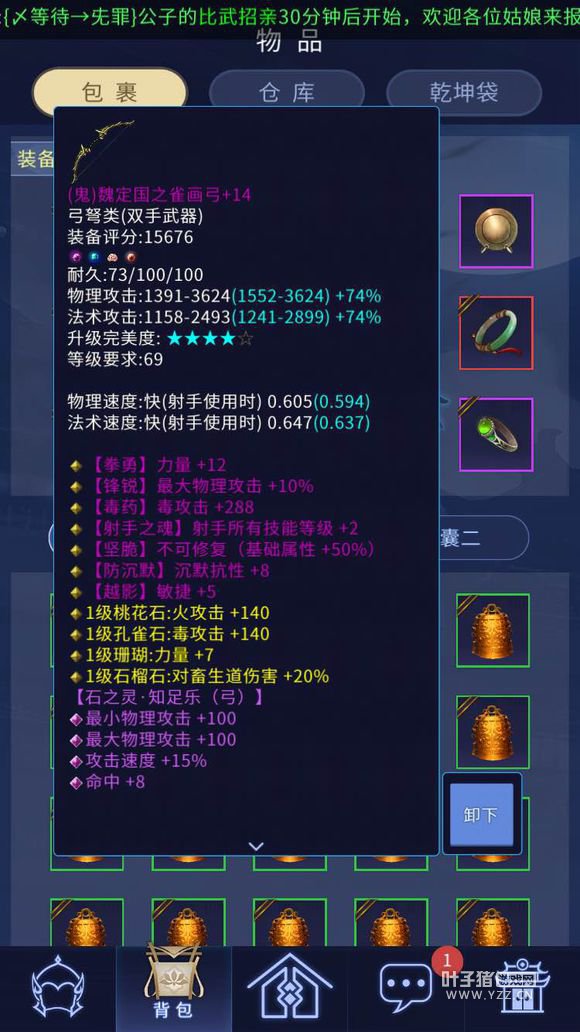 倩女幽魂中洗装备需要有良好的心态,充足的银两和一些极好的运气。不然就算洗出了逆天或者最大也是非常尴尬的属性。洗出逆天当然非常高兴,但是有一些属性就让人有点哭笑不得了!今天我们就来看看那些让人哭笑不得的武器,比如说逆天双最大扫把,不对,是一最大一最小。 7绝双最小毛笔。 逆天一最大一最小弓。 69级7绝不可修复弓。 更多精彩内容,尽在叶子猪倩女幽魂。 [编辑:子衿]