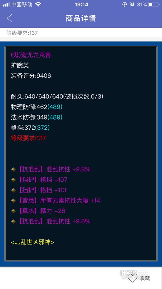 倩女幽魂中护腕最主要的属性就是格挡和大幅,但是如果能兼顾抗性的话那就是极品了!藏宝阁上这一个护腕抽的一手好冰呀,固定混乱抗百分比双格挡一大幅,每一条属性都有用,然后洗成了六绝双混乱抗百分比!虽然有点浪费双格挡的属性,但是双格挡数值比较高也可以当正装使用,还提高了抗性! 更多精彩内容,尽在叶子猪倩女幽魂。 [编辑:子衿]