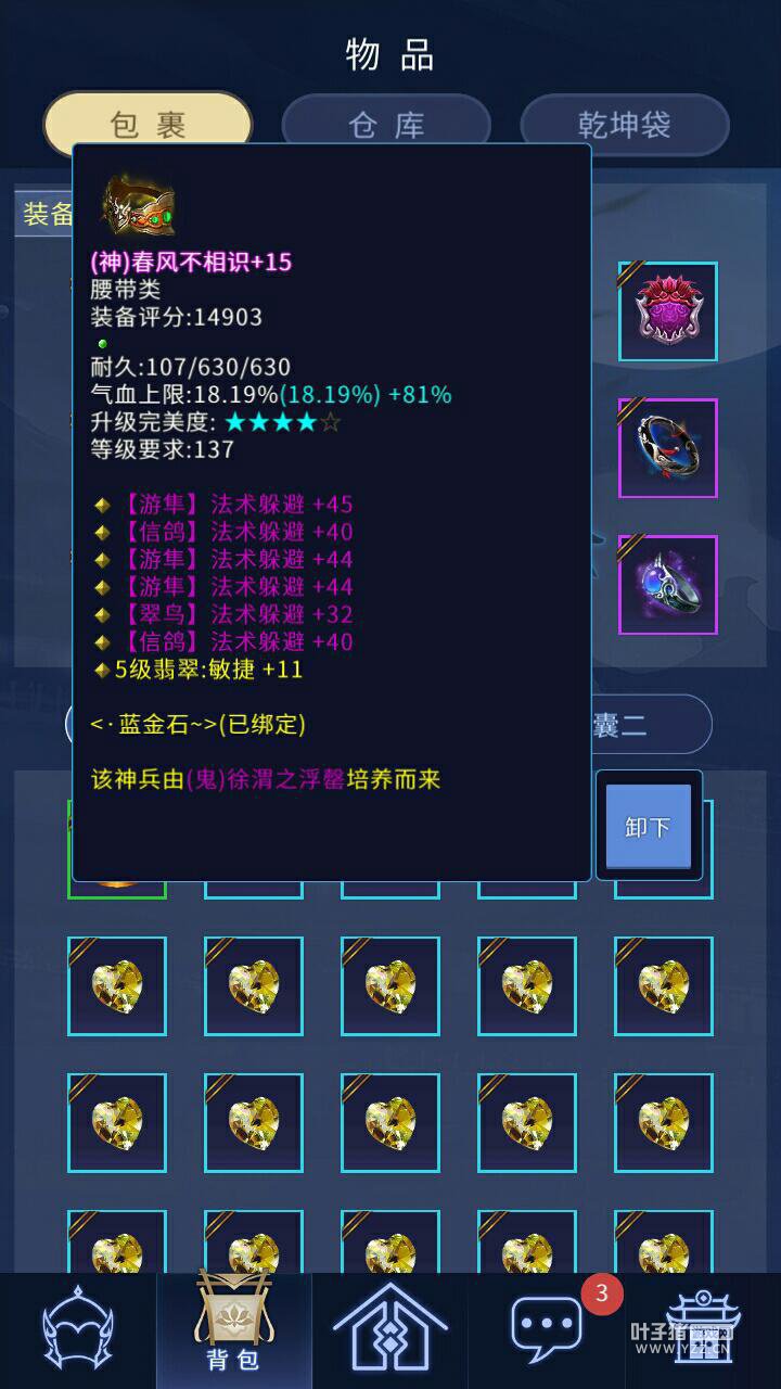 法术躲避路线是倩女幽魂后期很多玩家追求的属性,但是为了追求法术躲避的极致,需要舍弃很多其他的属性。比如说这个137的鬼腰带,为了抽法躲就把抗性和血都抽掉了,但是好在抽成了一个极品的法躲腰带,六绝六法躲,整整齐齐的看着也舒服! 更多精彩内容,尽在叶子猪倩女幽魂。 [编辑:子衿]