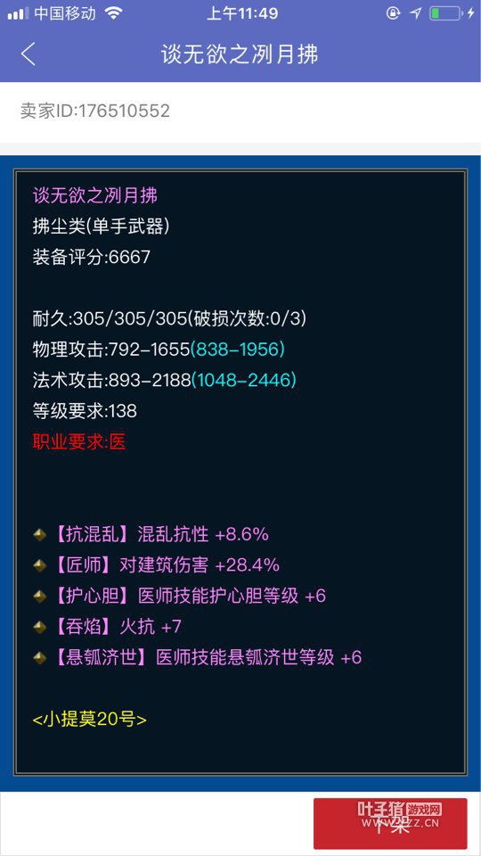 在倩女幽魂中医师一般都会用红扫把来洗成技能双6的属性,是因为红扫把洗起来比较便宜,而且开孔分较少。但是谁说紫扫把就不好呢?这个138的混乱抗百分比加医师护心胆和悬壶济世双6的扫把,看起来就值很多钱! 更多精彩内容,尽在叶子猪倩女幽魂。 [编辑:子衿]