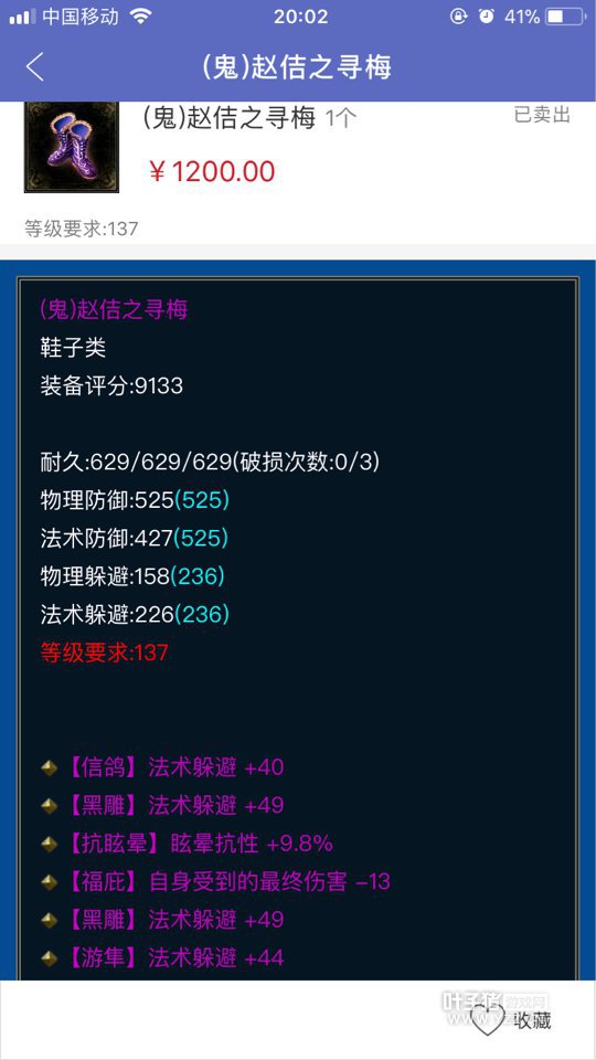 倩女幽魂中法术躲避高的话可以造成别的法系职业的攻击失手,一般抽的装备都先从帽子和鞋子下手。这个129的鬼鞋子就抽的很成功,七绝五法术躲避加混乱抗百分比还带根骨,属性可以说很完美了。 这个137的鬼鞋子也很不错,四法术躲避带眩晕抗百分比182点! 点击查询倩女幽魂一掌山河图坐标,更多精彩内容,尽在叶子猪倩女幽魂。 [编辑:子衿]