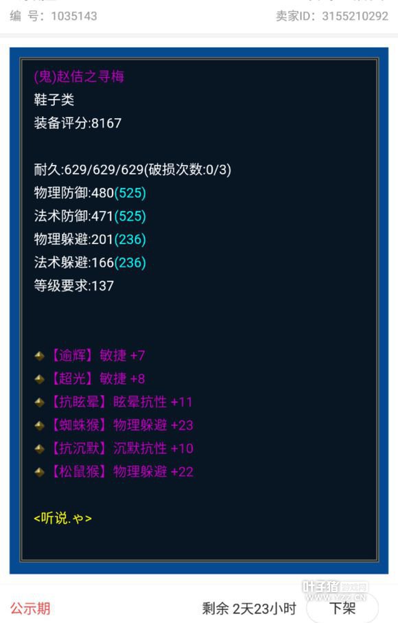 倩女幽魂中鞋子算是个既重要又不算重要的装备,如果鞋子洗出来的属性一般,那就没啥大用处。但是如果鞋子属性洗的好,那就是有用的!比如这个六绝双敏捷双物理躲避双抗的鞋子,每条属性都有用! 更多精彩内容,尽在叶子猪倩女幽魂。 [编辑:子衿]