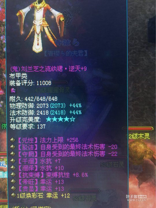 倩女幽魂中幸运装一半都是绿装或者是蓝装,防御攻击都比较低。小编经常打宝的时候换了幸运装被BOSS打死,有了这件衣服,麻麻再也不用担心被BOSS打死了!逆天双幸运的鬼布衣,加上焕彩石,打宝的时候再也不担心被打死了! 更多精彩内容,尽在叶子猪倩女幽魂。 [编辑:子衿]