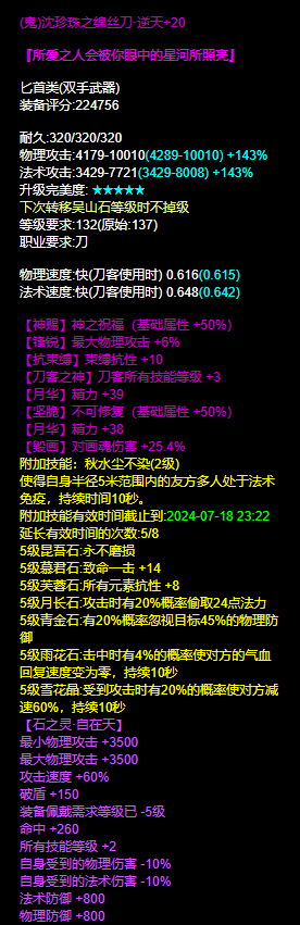 周三周三,关宁一战! 刚踏入关宁,就看见一旁战事激烈,只见神仙打架的战局中,自有一帅气断恨刀面对攻击不动如山,甚至还有功夫和本倩打招呼,究竟是何许神人何种神装,能配得上这样的气定神闲?快来和倩倩一起看看吧! 昵称:倚川. 职业:断恨刀客 等级:150级 区服:[彩云霁月] 帮会:欧气满满バ (以下数据更新于梦岛2024.6.18) 固定神赐+最大+刀客技能的匕首 洗出逆天不修万攻+画魂职伤 再打上五级自在天 乔总你为什么躲在角落不说话 五物躲的布盔 观自在进一步加强气血 词条整齐得治好了本倩的强迫症 又引发了本倩的眼红病 七绝不修+四物躲的皮甲 真是好羡慕少侠赢得不费力气 对手光是不为这件皮甲破防 就用尽了全力 六绝三物理致命+敏捷 +力量+关山+5的项链 真是半步杀一人 千里不留行 七绝五敏+抗法术致命的手套 敏捷max 对手:已老实,求放过! 六绝五物躲的腰带 感觉挺对不起少侠的 他就算光站桩不走位让我一把 我都打不到他 六绝五物躲+物防 少侠这词条 真的不是自家流水线批量生产的吗 七绝四物理致命+双敏+力量的戒指 出手快准狠 少侠以痛吻对手 对手直接痛哭 六绝五物理致命的戒指 让对手年纪轻轻就挣了两个亿 一个痛苦回忆 一个活着不易 七绝三物理致命+三敏的手镯 没关系 和这位少侠当对手 能挨他一招也很厉害了 逆天三物理致命+三敏+力量的手镯 差不多得了 少侠倒也不必强得如此惊天动地 六绝五物理致命+物理命中的挂饰 木做的门叫木门 铁做的门叫铁门 通往轮转司的门叫少侠的对手们 六绝五物躲的护心镜 这位少侠实在惹不起 物理输出们请在这边排队离开 这位150的断刀大大走的是暴力物躲流。武器方面逆天双50最大双手还有画魂职伤与所有技能+3,一把万攻完美神器,伤害简直让对手心惊,搭配高致命首饰与关山加成项链,十步秒一人不是梦,一套连招下来轻松清空对手血条。 防具上整体走高敏物躲,几乎没啥废属性,物躲整齐到让对面物理输出哭出声,提高战场生存力,方便能够打出更漂亮的伤害,双手刀在团战中还可以灵活切换法躲抗套和单手武器,妥妥属于物理团战核心的存在。 装备优秀的大大数量众多,神装秀不代表排名! 更多神装秀,请锁定叶子猪《新倩女幽魂》官方合作专区。 [编辑:叶子猪小秘书]