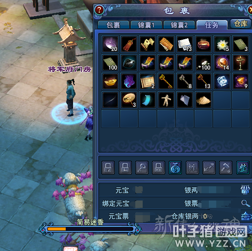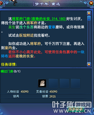 在286,279的位置,会有一个花瓶(我踢完才想起来截图), 踢了之后会获得药杵。 随后去找算卦人。 先收着。然后找打更人交付。 打更人是行走的游动NPC,如果没有就多走走,或者等一等,交付之后可以接下一环, 继续与打更人对话, 选第一个, 捡起来。 找吴生交付。 再找一边将军府门房领取下一环。 到303,214, 采摘。 翻出刚才的药杵,丢进乾坤袋。 进门,门口有两个水缸和花瓶, 捡起来,随后到148,240进门。 点完下面三个选项, 找吴生交付,并接取下一环,也有一段小动画,