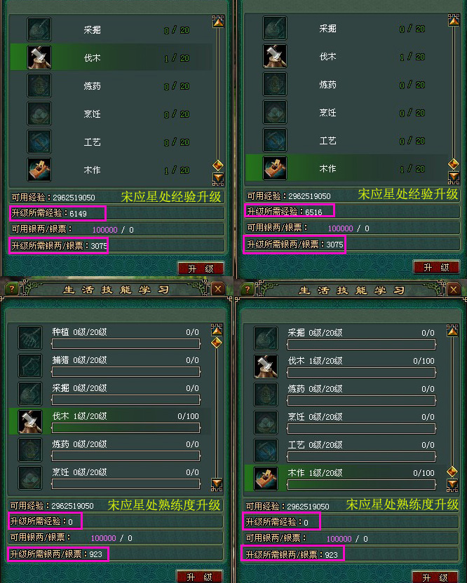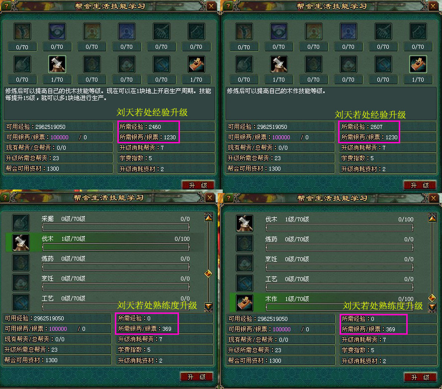 【二、技能等级20级后需要进入帮会学习提升】 当玩家生活技能达到20级后,则需要加入一个帮会,在帮会药房的NPC"刘天若"处继续升级生活技能。同时升级生活技能需要消耗一定的帮贡和银两 1.使用经验升级技能:就是用人物角色经验升级技能,和宋应星不同的是需要消耗帮会贡献,但是银两减少很多 2.使用熟练度升级技能:就是当你的熟练度满了以后可以来这里学习,和宋应星不同的是需要消耗帮会贡献,同样银两也是减少很多 进修生活技能的NPC包括杨家镇的宋应星和帮会药房的刘天若,每位NPC处都提供利用经验升级和利用熟练度升级两种方式。 玩家在宋应星处只能将生活技能修炼到20级。如果玩家加入了帮会,则可以在帮会中将生活技能修炼到更高的等级。 注:帮会进修需消耗帮贡从而减少经验和金钱的消耗。生活技能3-5级后就应该用帮贡进修。四种升级消耗对比