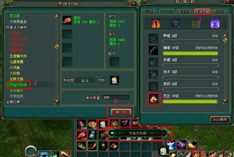 【六、如何使用生活技能制造产品】 当你使用采集道具完成时间倒数最后收成原料之后,你就可以点击你的烹饪技能进入烹饪列表单选择你要制作的产品啦。 1.鼠标左键点击技能图标弹出技能栏。 2.鼠标左键点击技能栏生活技能选项。 3.鼠标右键点击烹饪技能图标弹出烹饪列表单。 4.鼠标左键选择你要制作的烹饪产品。 5.鼠标左键点击制作开始制造。 6.制作中的进度条 【七 、如何选择最佳生活技能组合】 1、以职业角度选择: •异人:异人靠宝宝杀怪较少吃药,建议学伐木和木作,旗子自给自足之余还可以出售赚取一笔。 •甲士:所有职业就甲士吃药最厉害,不管防御高低红或蓝消耗都不少。建议学捕猎和烹饪。一只四圆扒鸭足够甲士清完一堆小怪再补满MP。 •侠客、魅者:有输出又有辅助的侠客,吃蓝很厉害。只做全辅助型侠客,那消耗蓝并不多。建议学种植和炼药,吃瞬补药(4秒回复)保命即可,魅者职业也是如此制作瞬补药。 •方士:吃蓝王,就学捕猎和烹饪吧。如果你操作不那么好,那就学种植和炼药做瞬补药。 •医师:医生的命在队伍中显得很重要,应吃瞬补药。可医生耗蓝也不少,看操作来选择吧,种植和炼药或者捕猎和烹饪。 •刀客、弓手:同为输出单位,耗蓝很多,学捕猎和烹饪好。 2、以赚钱的角度选择: •捕猎烹饪:捕猎烹饪是专门做20秒蓝药。几乎所有职业都是耗蓝多,从市场需求去看绝对是烹饪做20秒蓝药最吃香,简简单单赚钱的话就学捕猎和烹饪吧。 •种植烹饪:种植烹饪是专门做20秒红药。由于吃红的职业也就是甲士,他们抗下所有攻击,还有医生帮加血。因此20秒红药需求量无法和蓝药相比。 •种植炼药:种植炼药是专门做3秒补药。由于瞬补药和20秒补药可以同时吃,所以造成瞬补药有自己的市场。瞬补药的量没有20秒多,但打BOSS或PK时候保命显得非常重要。 •伐木木作:伐木木作是专门做飞行旗,官府任务和安魂任务令飞行旗的业绩增加,需求量大大提高,但后期旗子可以飞100次甚至500次,回头客较少。 •挖掘工艺:挖掘工艺是专门做辅助药、装备质量提高的道具。这一行业选择的人最少,其原因体现为:工艺要配合伐木和挖掘,需要开动小号。还有制造条件都相对麻烦。在如此繁琐的条件下很多玩家都不愿意选择。总结工艺是有钱人的行业,他面向的客户都是有钱人,可以说是后期的赚钱生活技能。 [编辑:蓝月]