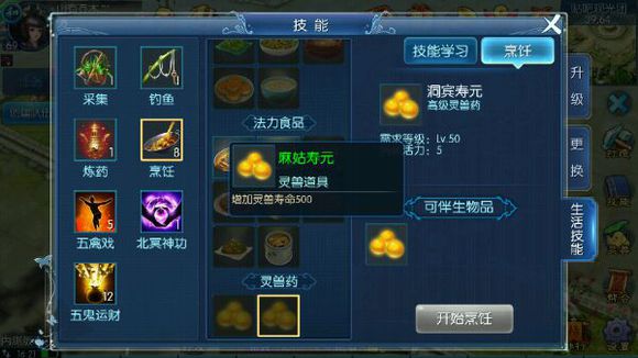 烹饪可以制作灵兽药,用于增加宠物寿命。不需半成品(我没有看到有半成品说“同时是灵兽药材料”……),只需要消耗活力,同时有一定几率获得伴生物品(还是灵兽药……麻姑寿元---加500寿命值那个)