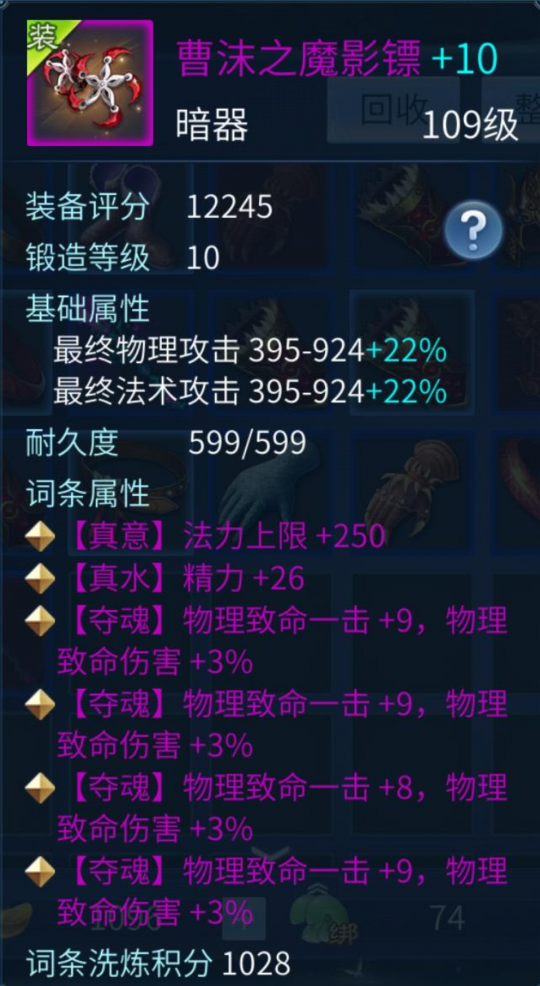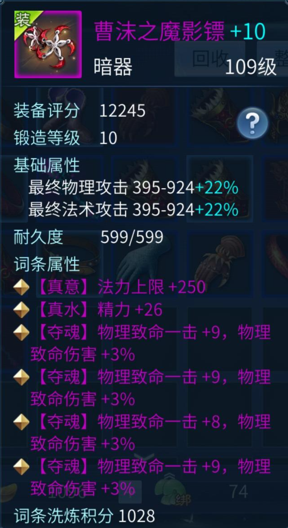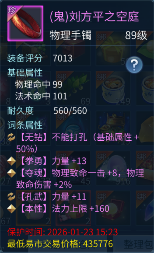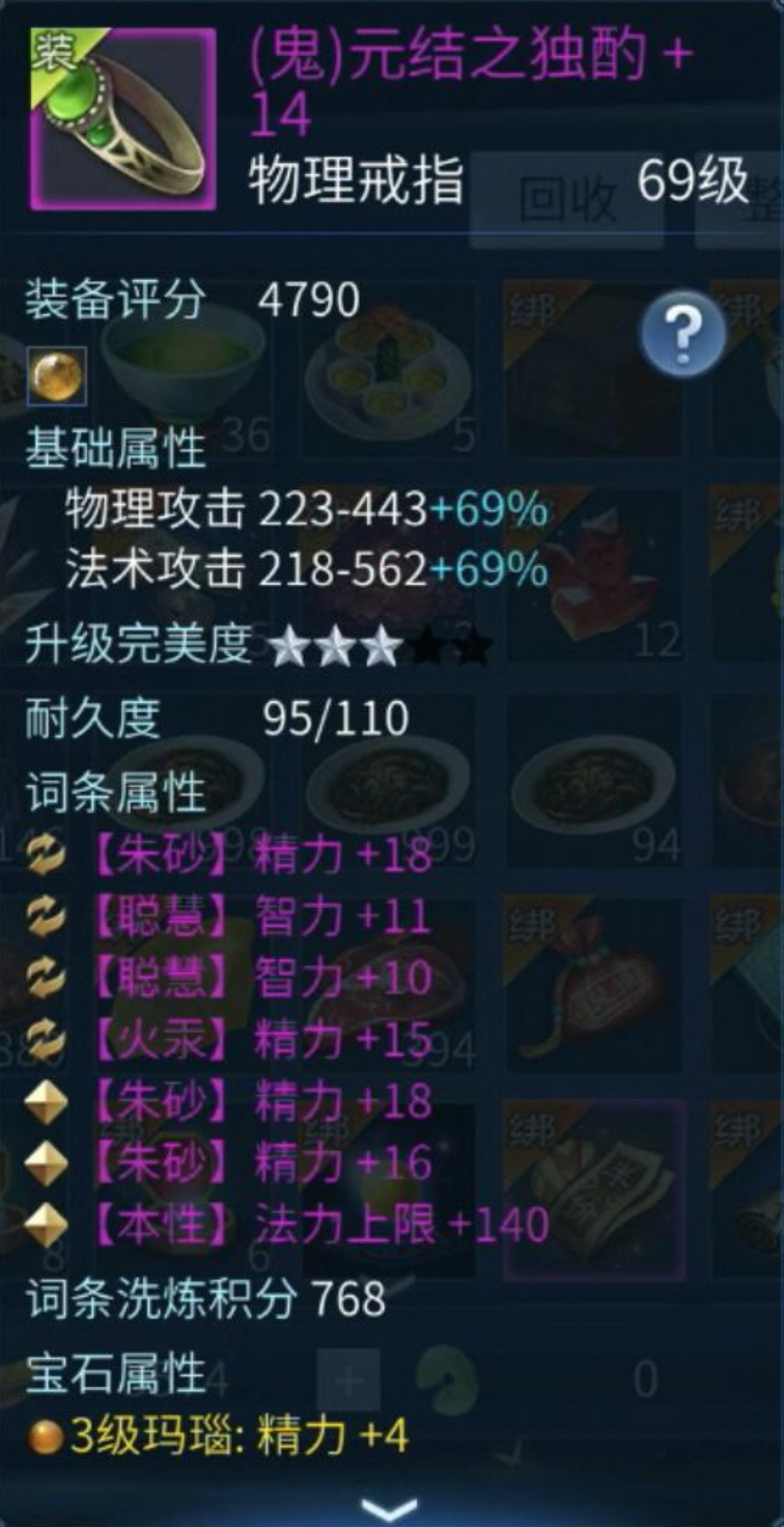 小伙伴仅用一次抽冰,将第四条词条精准置换为无钻,虽然侠客之魂被替换,但凭借最大与攻速、无钻词条,依旧让这件武器实力出众。 - 来源:投稿@君卿云 - 仅仅置换6次,小伙伴便得到了这件方士职业的准毕业武器,不仅有双最大法术攻击+16%,还有固定法术攻速+10%,让无限腹语的达成难度下降不少。 - 来源:投稿@吃饺子不吃皮 - 这件装备既有双五十加成,又携带了法术命中与敏捷词条,是一件兼顾气血与命中的手套,最亮眼的当属它的洗炼积分,仅用8910分便洗出了双五十,这般运气,真是让菌菌眼馋! - 来源:投稿@尐佛波乐° - 精力词条在大多数小伙伴眼中作用较小,但是在画魂看来,这绝对是实打实的优质属性。这件装备不止有4条精力与1条法力上限加成,还有两条智力词条,甚至洗炼分也相对较低,是69等级段画魂理想的输出装备。 - 来源:投稿@云祺 - 随着躲避路线的流行,手镯位置也开始侧重补充命中属性。这件固定无钻、双力量带致命的手镯,除去高命中之外,同时还兼顾输出属性,并且无钻词条也节省了号主六级昆吾石的花费。 - 来源:投稿@暴力小阿兔*_ - 四条高数值物理致命词条,仅用1028洗炼分拿下,对于缺少致命属性的小伙伴来说,拥有这件暗器,一刀一个小暴击! - 来源:投稿@养羊 - 有哪位医师可以拒绝这枚戒指?三条全元素抗%+16%,大幅提升PVP生存能力,同时拥有减伤与沉默抗性,综合属性相当亮眼。 - 来源:投稿@宝妹妹·° - 叶子猪手游通-温馨提示:搜索“倩女手游QQ群”127405013,加入叶子猪倩女交流平台,专门为玩家提供最新游戏攻略、资讯以及礼包领取!还会不定时发放丰厚玩家福利!赶紧邀请小伙伴,一起来畅玩游戏吧!