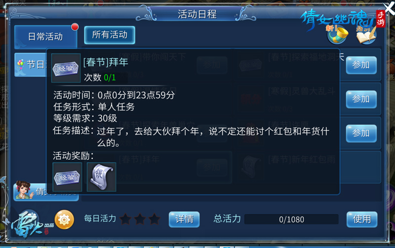 元旦假期虽已过去,但节日的氛围不减反增,除了快要到来的春节,莘莘学子期盼已久的寒假也即将迎来。为了迎寒接春,倩女手游诚意满满,即将开启长达近一个月之久的长期福利活动,每日签到送好礼,新副本灵兽陪你闹翻天。新年期间更是福利翻倍,任性红包雨、新年祈福礼包,有机会获得iphone7、零食大礼包等线下大奖,让你在这个寒冬里热血沸腾!你准备好了吗? 寒假不冷清,超长福利活动陪你温暖过冬 紧张的学期接近尾声,寒假将近你打算怎么过?1月12日~2月6日,倩女手游超长时间、福利满满的活动即将来袭,每日签到领取海量元宝、大力丸,节日签到礼包更有机会开出金刚钻、宝匣钥匙等珍贵道具。化身呆萌灵兽挑战全新趣味副本,与灵兽一起闯荡三界赢取丰厚奖励! 三界的灵兽们跟随主人东征西战忙活大半年了,是时候该犒劳一下了,大明皇帝特此开放三界灵兽乐园。主人们可以和众多灵兽一起完成“灵兽大乱斗”任务,提高彼此的默契度并能获得丰厚的奖励。 “灵兽大乱斗”共分为两个部分,第一部分需要组队进行,进入趣味副本后,少侠将随机变成一种呆萌的神兽模样,在场景中使用“跟随”技能捕捉场景内的灵兽,让他们跟随在自己身后获得积分,挑战时间结束后,结算每人的总积分。少侠们不要贪心去捕捉相同的灵兽,否则会落跑扣除积分。 “灵兽大乱斗”结束后,解锁第二部分任务“带你闯天下”。规定时间之内与自己的出战灵兽一起击杀怪物,最后总得分越高,所需杀怪数量越多,最终奖励越好。 新年福利再加料,iphone7、红包雨领不停 过新年就要热热闹闹,在1月28日-2月3日春节期间,除了持续不停的寒假活动外,一大波更加诱人的福利降临三界。NPC发新年红包,神秘人遍撒红包雨,还有iphone7、零食大礼包等线下奖品任性放送! 过年了,去给大伙拜个年,说不定还能讨个红包。参与春节拜年活动,少侠们就会收到来自各个NPC送出的新年红包,快来走亲串巷讨个吉利! 新年期间,福地洞天降临三界,通过金陵NPC包打听进入福地洞天击杀副本中的三个boss将获得大量经验及珍稀食材,珍稀食材还能在副本中通过采集获得,集齐10个可在包打听处兑换什锦虾仁和灌汤明珠秘制食材。拥有一定的食材后,少侠就能在家园中制作一桌美味的饺子宴,召唤朋友共享饺子宴,便可获大量经验! 春节又到了年兽侵扰村民的时候,少侠们前往蒲家村,获得年兽洞穴线索击杀年兽后,将有概率掉落年兽元神,霸气又拉风。 没了年兽的威胁,蒲家村的新年十分祥和,村口的大树上挂满了人们的新年愿望,写下你的新年愿望吧,或许会有意外的惊喜礼物。在礼物中,包含各种价值不菲的游戏道具,更有iphone7、零食大礼包以及和代言人杨洋线下见面的机会哦! 从除夕夜到年初三晚上,神秘人物还将在晚上20点-22点每个整点在三界遍撒红包,普天同庆新春佳节!各位少侠千万不要错过! 了解更多相关信息,请前往http://qn.yzz.cn/sy/