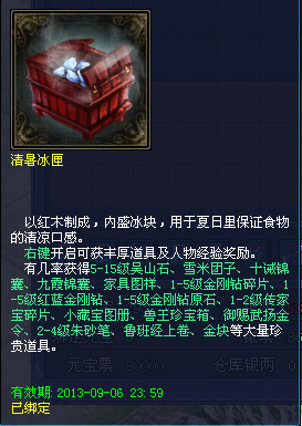 活动三:秋鸿赠礼 活动时间:2013年08月26日00:00 —— 2013年09月06日23:59 等级要求:50级及其以上所有玩家(在跨服服务器无法参与) 活动介绍:活动期间,50级以上的玩家每在线30分钟就可获得1个清暑冰匣,打开后可获得丰厚道具奖励。每个玩家每天最多可获得5个清暑冰匣。 清暑冰匣奖励列表: 秘制豆角、雪米团子、1级血色花泪、宝匣钥匙、5-15级吴山石、秘色瓶宝箱、九霞锦囊、十诫锦囊、五色土、1-5级红色金刚钻、1-5级蓝色金刚钻、1-5级金刚钻碎片、1-5级金刚钻原石、各式家具图样、金块、金条、小藏宝图册、保灵丹、妙品五色云、妙品高级碧柳露、三星膏、再生液、焕然液、蒺藜草汁、棣棠花露、沧海石心、兽王珍宝箱、影无踪、鬼不识、金钟罩、琉璃镜、破隐、鲁班经上卷、五/十石仓、2-4级朱砂笔、1-2级传家宝碎片、如影衣、御赐武扬金令、小束薇草、小篮银桃 活动四:秋实满园(尚未开放) 活动时间:2013年08月29日10:00 —— 2013年09月05日07:59 等级要求:所有拥有家园的玩家 活动介绍:活动期间,所有拥有家园的玩家在收获作物时,均有几率直接获得新家园装饰物——百年好合和龙门阵,它们可作为功能性装饰物摆放。也可以放入1级以上家园的装修仓库中,再作为美观性装饰物摆放。