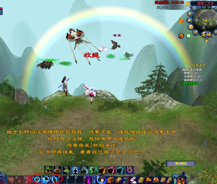 倩女幽魂2清明节活动测试:小编抢先体验报告。这次的清明活动奖励还是很不错的哦,至少告别了人参果的诅咒有木有! >>>>>春雨带礼来 倩女幽魂2清明节活动任务介绍 这周维护后,2014年的清明节活动在个别服务器进行了测试,小编有幸可以第一时间体会到本次清明节活动任务,下面就简单描述一下本次的活动吧 一、清明雨:在线得礼包 每天在线每隔15分钟就可以得到一个礼包,每天可以获得8个,也就是说玩家需要在线2小时就可以拿完奖励了。 打开就可以获得很多奖励,甚至有高级吴山石,小编就开到一块10级的吴山石。 二、踏青赏春:进副本杀怪 这个没什么好说的,每天3天,自己接任务后队长开车进副本,清完小怪BOSS出现,撸完就完成了。 主要本里面的怪物经验挺多的,但是数量少,还是不建议开双了。另外BOSS吃幸运,可以开幸运号尝试爆装备哦。 完成任务后同样会给一个礼包,目测奖励和在线礼包差不多 三、放纸鸢:小游戏积分大战 实际上是比拼积分的小游戏,双人组队进本,队长获得三个技能负责放风筝,队员获得掷银盘技能负责打飞鸟。 进本后队长开始按轻拉扯起风筝,一直使用轻拉技能保持风筝的起飞状态,同时看屏幕提示,风大了要用放线技能,风力不够要用收线 队员将鼠标对着飞鸟,用掷银盘技能击落飞鸟,保持风筝的漂浮,坚持得越久积分越多,10分就可以完成任务拿礼包了。积分榜前六可以额外获得大礼包哦。 总结 这次活动的礼包开出的物品还挺多的,御赐特免牌、武扬金令、琉璃珠、帮贡丹什么的,但人参果不多,可以说是逃过了往年活动大量人参果泛滥占包包的诅咒啊,甚至人品好的还可以像下面这位玩家一样: 具体来说这个清明节活动还是值得一做的。 小编吐槽:早上还有玩家爆出放纸鸢任务会奖励170W银票,结果下午小编做的时候只给8000多了,真的是no zuo no die啊。。。 [编辑:蓝月]