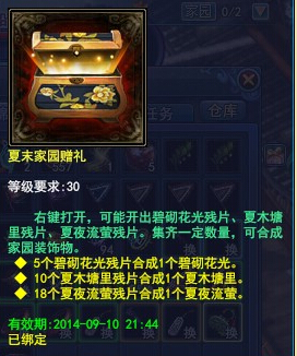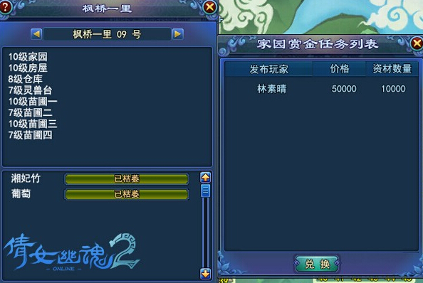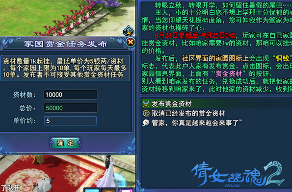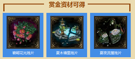 活动四:赏金资材 活动时间 2014年8月28日维护后——9月24日23:59 抢先体验 8月21日——8月27日,点将台、豪情痴、执子之手服务器抢先体验! 活动对象 幽梦家园所有玩家 活动详情 8月28日维护后——9月24日23:59,玩家可在自己家园挂赏金资材,用银两买别人家的资材。 赏金资材在管家NPC处发布后,社区界面的家园图标上会出现“铜钱”标志,代表此户人家有发布赏金。点击图标,会出现家园信息界面,上面有“赏金资材”的按钮。 其他家园资材满足兑换条件的玩家点击社区界面的家园图标上出现的“铜钱”标志,符合条件,即可把自己资材转移,获得扣去手续费后的银两。手续费50%。 注意: 1、夫妻二人以家园为单位,每个家园最多同时存在10单,每个玩家每天最多发布10单。 2、发布的玩家,当日不可接受赏金资材。 3、每接收赏金资材任务,均有机会得到[夏末家园赠礼],可开启礼盒有几率获得家园装饰物残片,攥够数量可在乾坤袋转化为家园装饰物。 4、取消已经发布的赏金,家园变为地契,夫妻离婚,会强制取消已经发布的赏金单子,赏金返还给玩家,扣除10%手续费。活动结束,赏金单子自动取消则不扣除手续费。 社区界面的家园图标上会出现“铜钱”标志,代表此户人家有发布赏金。点击图标,会出现家园信息界面,上面有“赏金资材”的按钮。 其他玩家点击“赏金资材”可看到对方需要的数量与总价。 同时,兑换资材的玩家均会收到夏末家园赠礼。右键打开,有几率得到碧砌花光残片、夏木塘里残片、夏夜流萤残片。