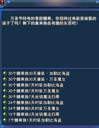 万圣鬼屋每天1次,主要获得经验和灵兽 坚持30秒活动可以做2次,最多可以得到6个宝箱,如影衣什么的都可以开出来 任务奖励的万圣节糖果可以换取万圣节魔女、加勒比海盗时装和扫帚坐骑,大家千万不要错过了
