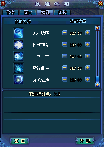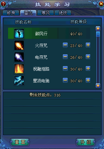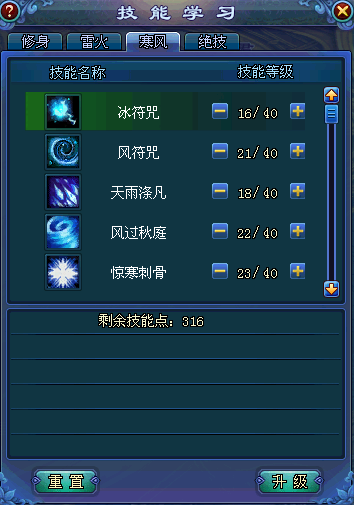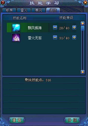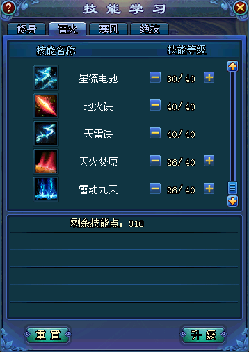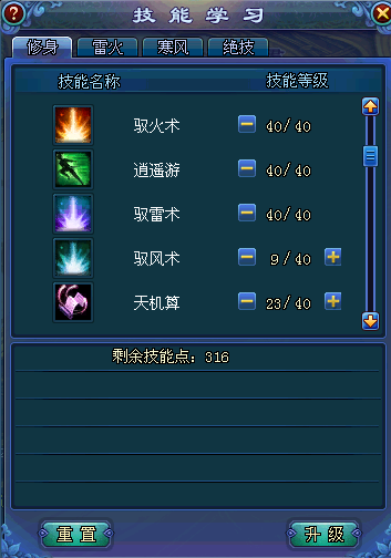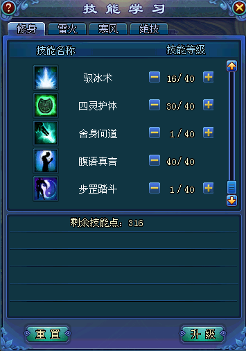 这里需要注意,方士的技能加点有两种选择。点满腹语防止魅者控制或不点腹语、将雷火点到35级提高雷火伤害。如果选择雷火的话,需要将纹饰、抗性、临时抗中的水冰抗全部更换为控制抵挡和控制抗哦! 点修为修炼 方士修身类技能点安排建议 方士雷火类技能点安排建议 方士寒风类技能点安排建议 方士绝技类技能点安排建议