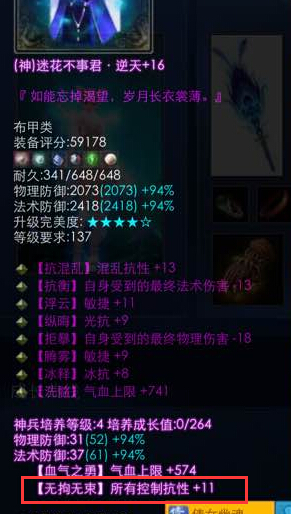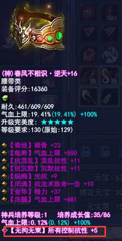 另外,不要小看神兵额外给的属性,腰带衣服的抗性是最叼的,露珠真的很讨厌洗装备 而且洗神兵很贵,这2个抗性大概洗了不到100,很多大神衣服是减伤+抗性,那个很难洗,脸好的几下就出来了,脸不好的 给洗好几捆 ,好费钱的,所以露珠只要下面的11点抗性 ,腰带还没培养起来,培养起来抗性还可以更高。你们要注意 这里加的是所有控制抗!一个肾也不过加那么多点控制抗,一个4级神兵就可以加这么多控制抗,你们觉得那个划算点呢? [编辑:蓝月]